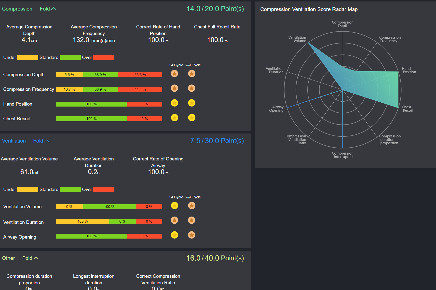 9)   Users can view single task training details, including total training score, total duration, number of cycle groups, compression score, average compression depth, average compression frequency, compression position accuracy rate, chest full recoil rate; ventilation score, average ventilation volume, average ventilation duration, airway opening accuracy rate; compression percentage of the entire CPR, maximum interruption time, etc. Scores can be displayed in radar charts. Automatic comments are available for reference.